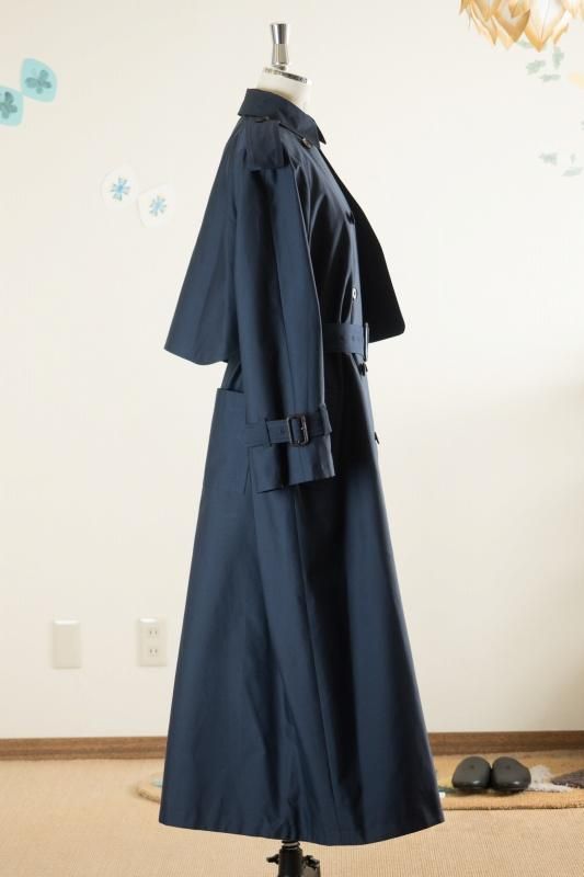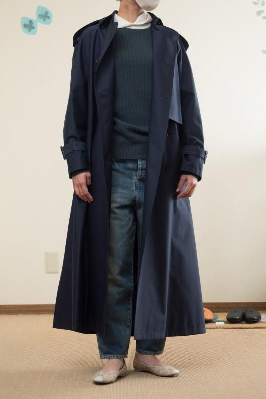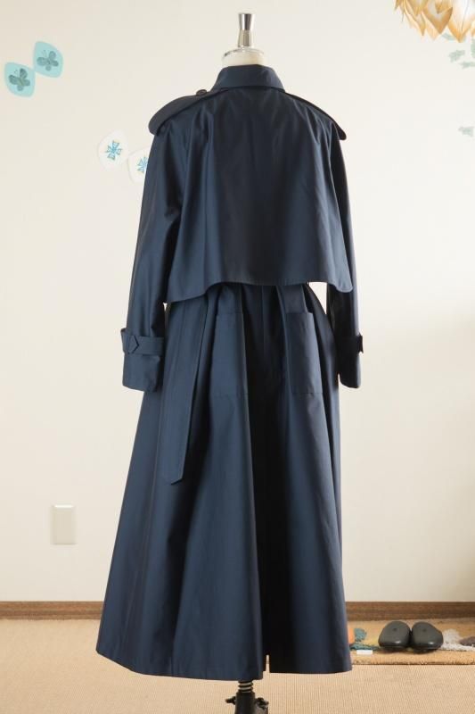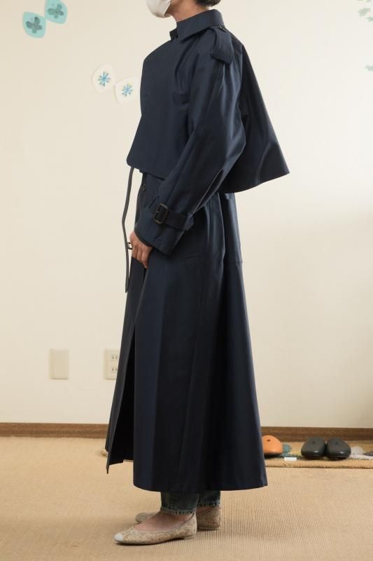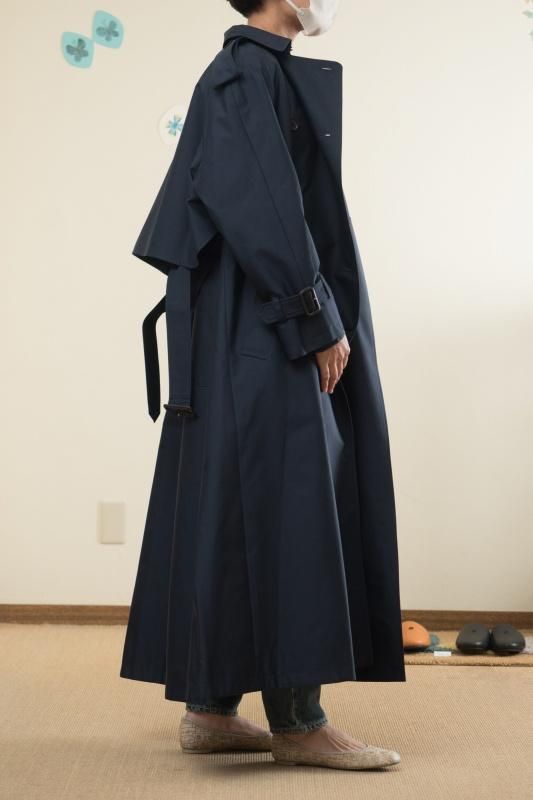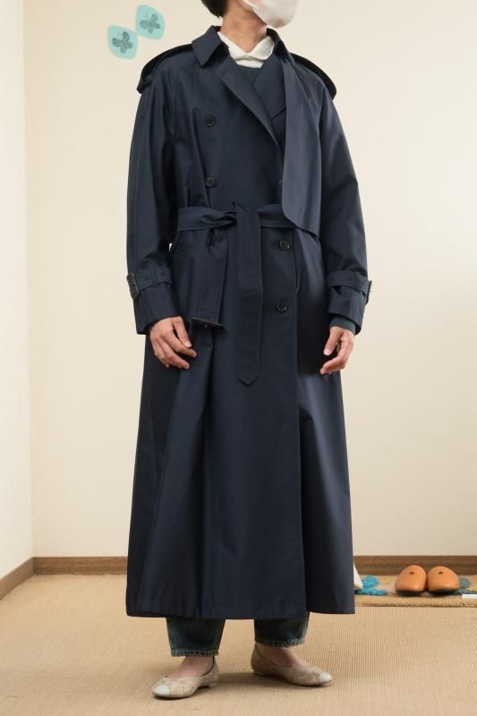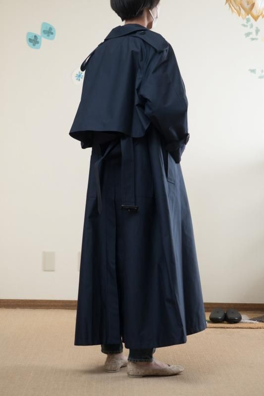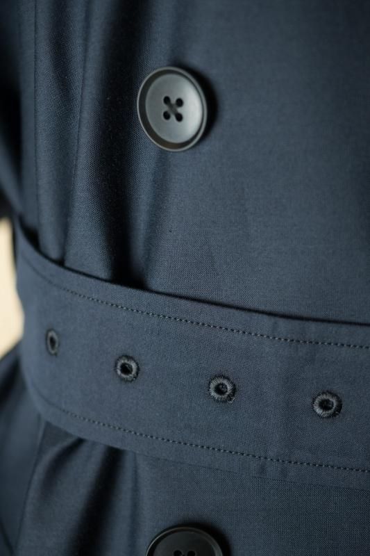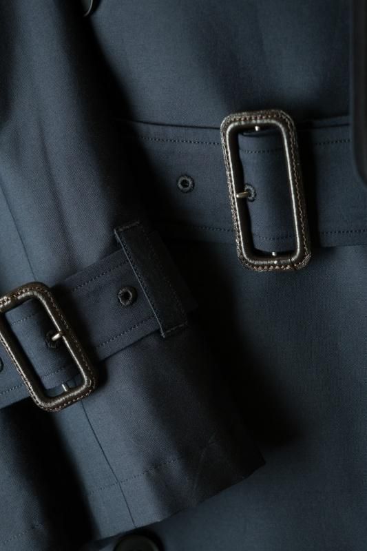 上品なビッグシルエットに仕立てたトレンチコートです。経糸にシルク糸、緯糸には高密度にコットン糸を織り込んでいます。緯糸の割合が多いため、仄かな光沢がありつつもマットな質感に仕上がりました。ウエストベルトは結んで着用出来るよう少し長めにデザインされ、袖口のベルトは絞ってボリュームを調節出来るように細部までこだわるデザインです。