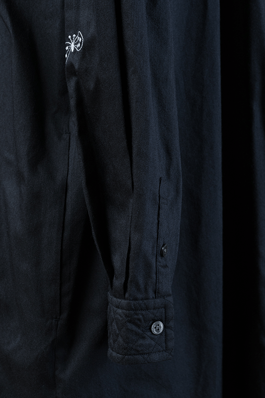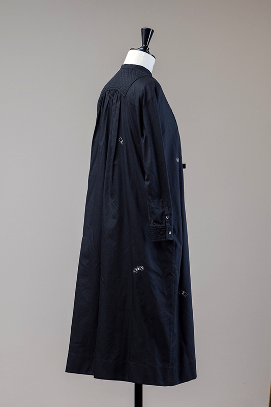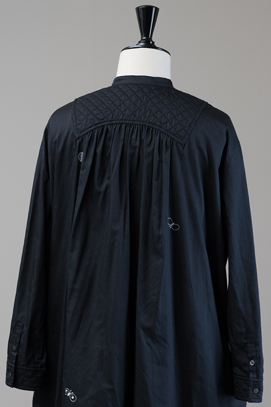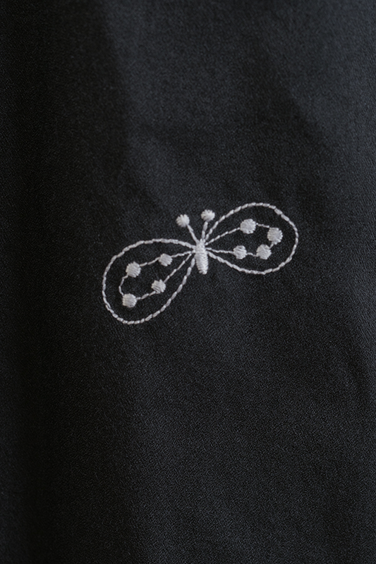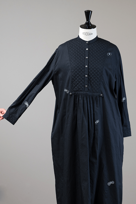choucho(チョウチョ)2001年初夏コレクションに発表されて以来、皆様に愛されミナ ペルホネンを代表するテキスタイルとなりました。経糸にシルク、緯糸にシルクウールの混紡糸を使用したジョーゼット生地を使用し、軽やかに舞うチョウチョの姿を刺繍で表現したワンピースです。ヨークとカフスにキルティング加工を施し、ウエストに細かなギャザーを寄せたデザインが特徴です。ドライな風合いの質感で軽やかな着心地です。