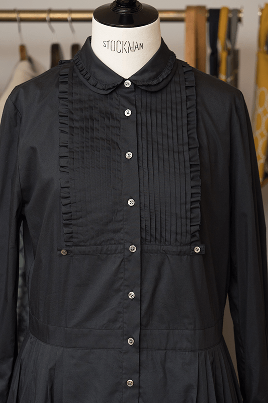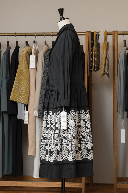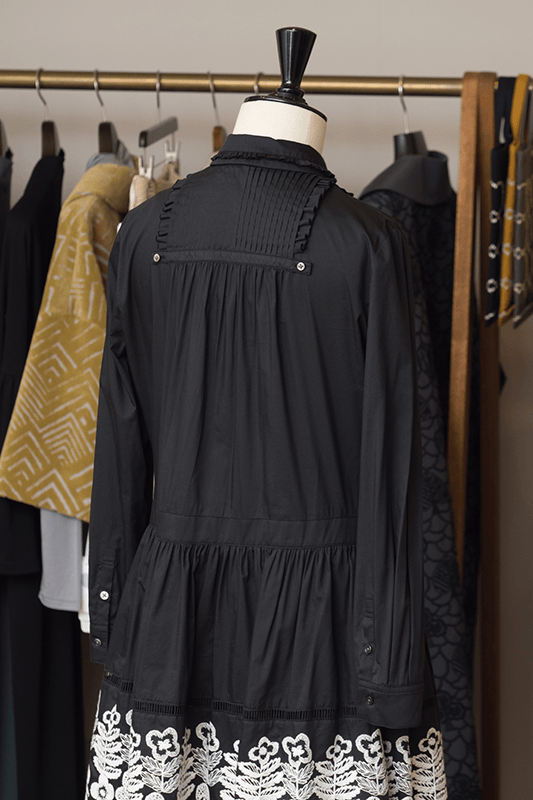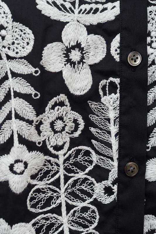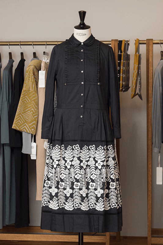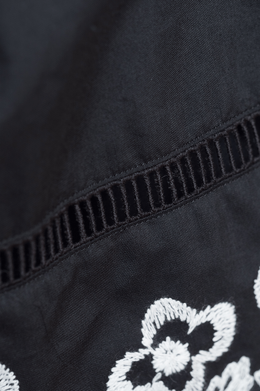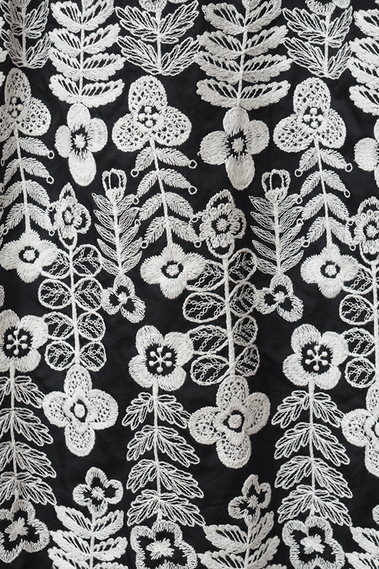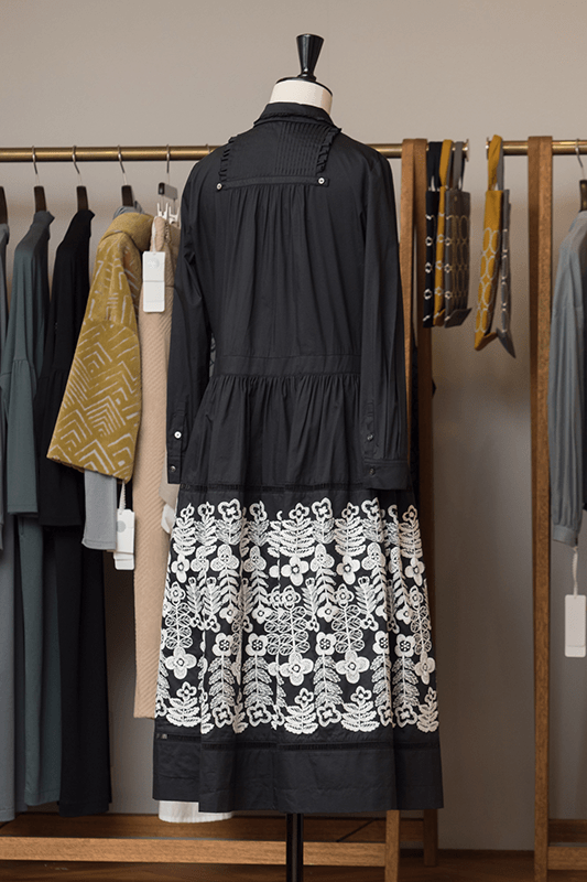 程よくハリのあるベース生地に草花の刺繍が広がるワンピースです。お花の刺繍の上下にはしごレースを施し、襟にフリルを重ね、胸元と背中側にピンタックを畳んだデザインが特徴です。薄すぎず、厚すぎず、肌にさらりと軽やかな着心地です。