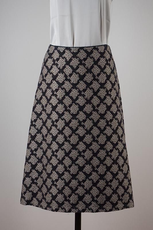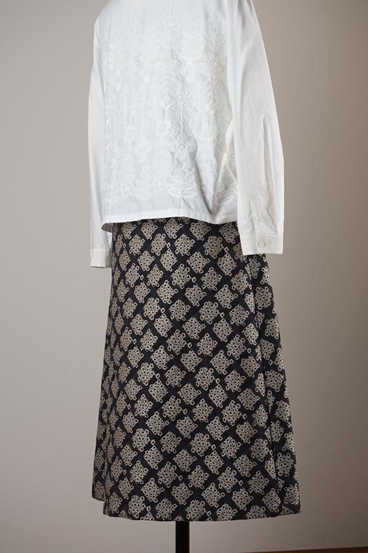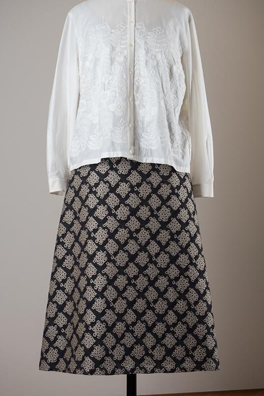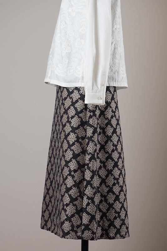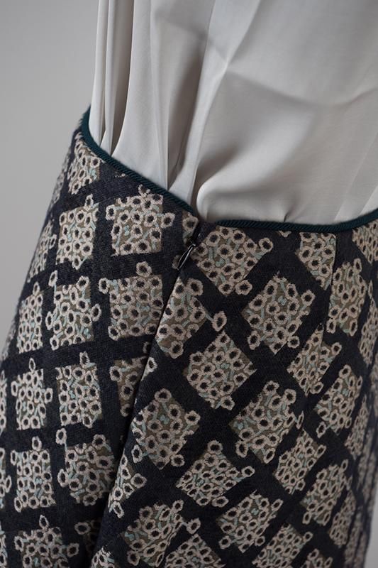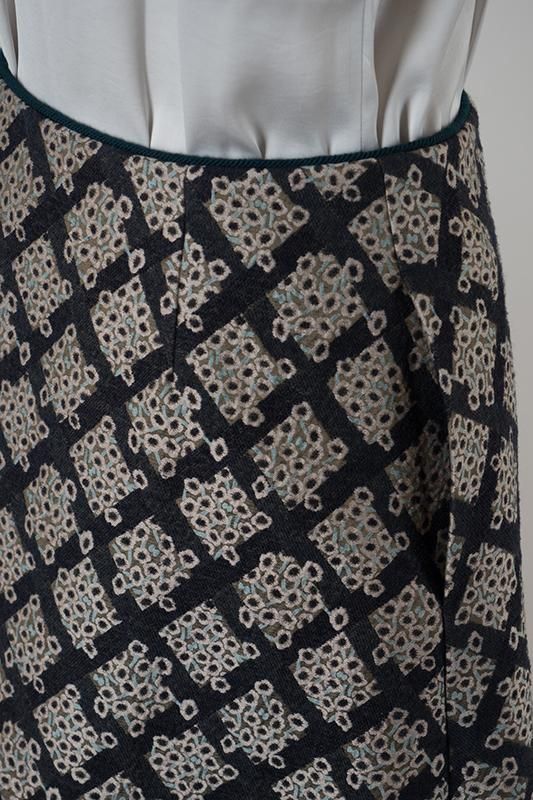 土の中、雪の下、アスファルトの下、見えない所に根は深く張り、エネルギーを蓄えてもりもりと生えてくる草花の生命力をジャカード織りで表現したセミフレアのスカートです。チェック模様はウール、花のベースにシルク、花はコットンと、平面な図案に色々な糸を使うことで様々な表情の変化から奥行きや立体感を持ち、温かみを感じられるような生地になりました。