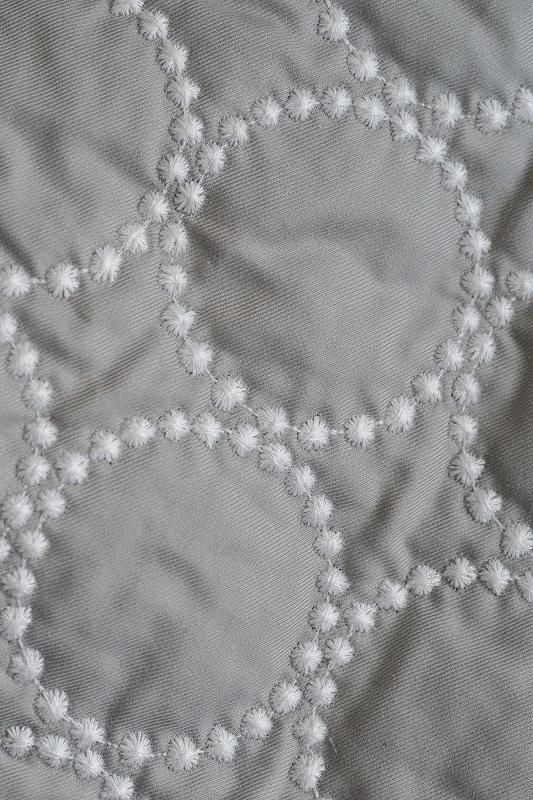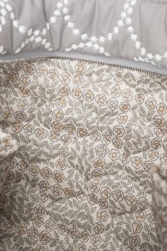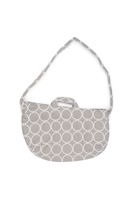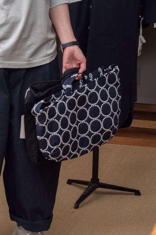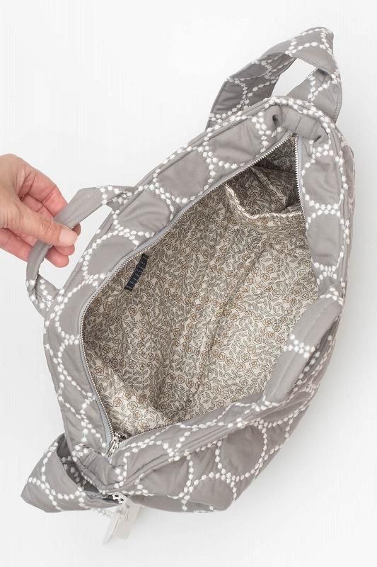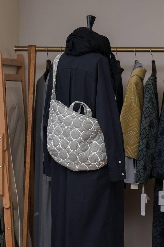 小さなドットが連なる、タンバリンをモチーフにしたサークル模様が刺繍された、軽やかなキルティング素材のバッグです。高密度で織り上げたコットンツイル地に刺繍を施し、中綿を入れ軽やかに仕上げていますやわらかな光沢のある素材をベースに、裏地は”sleeping rose"の生地をキルティングした素材を使用し、表地のテキスタイルがきれいに見えるよう程よい厚みのある質感に仕上げています。