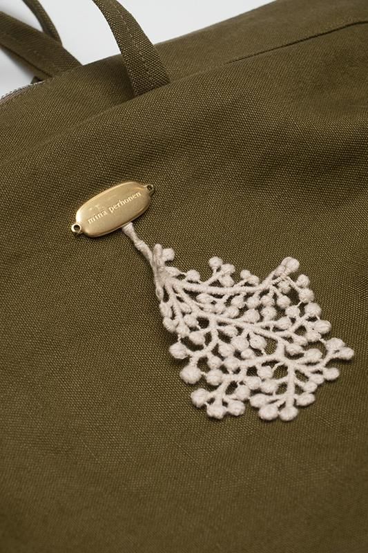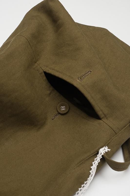 肩掛け用のショルダーの紐が付き、物を入れることで底の生地がたわみ、丸みのあるシルエットになる形状が特徴です。内側左右にポケット、外側からも物を入れられる仕様になっています。アクセントに真鍮のプレートとレースのモチーフが付いています。