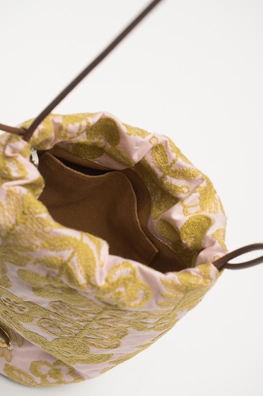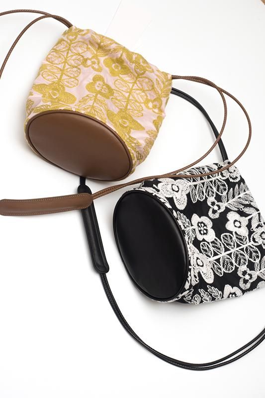 くしゅっとした巾着のフォルムがお菓子の「カヌレ」のようなポシェットです。肩にあたる部分や、肩紐、底にはレザーを使用し、真鍮製のブランドタグが素敵なアクセントです。内側にポケットが付き、日常使いにお使い頂きやすいサイズ感も魅力です。