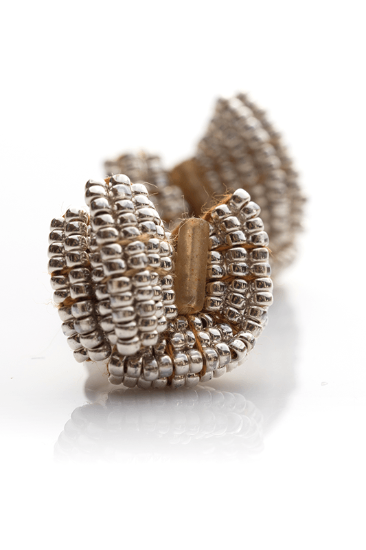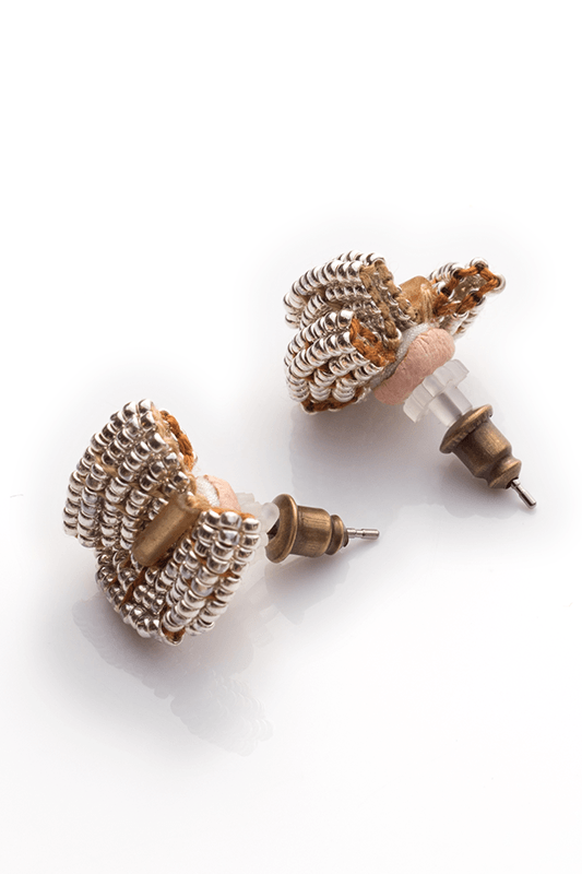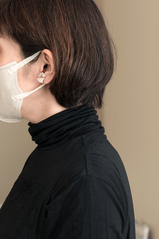 極小のビーズをギュッと敷き詰め、扇形に折り曲げ形作られたピアス。リボンや蝶の羽にも見える愛らしいシルエットに。一つひとつ手作業でビーズを施しています。
