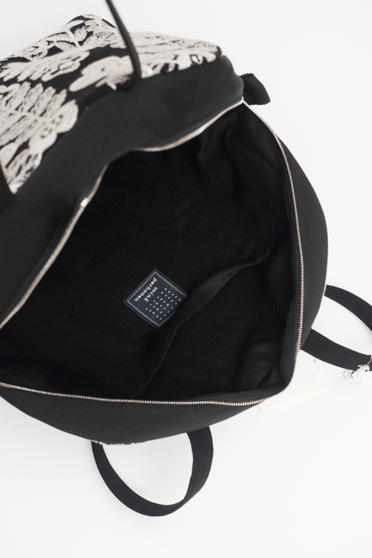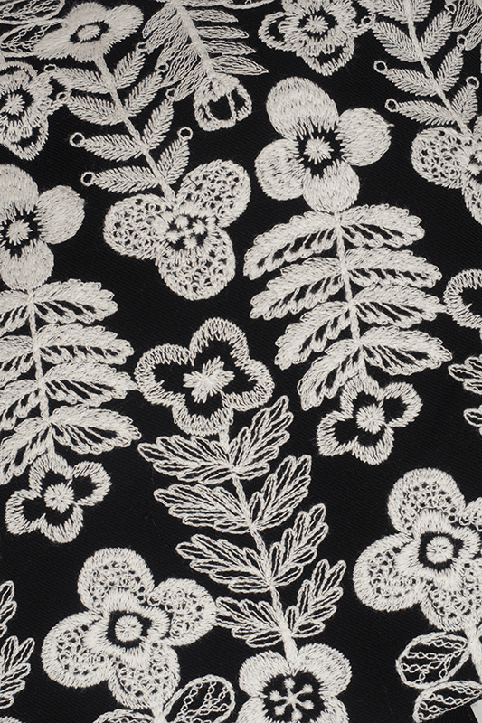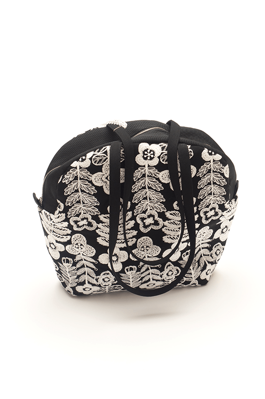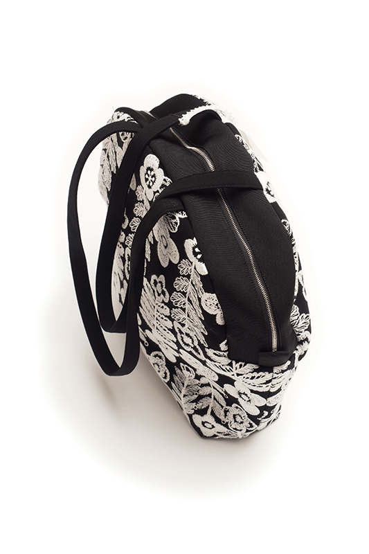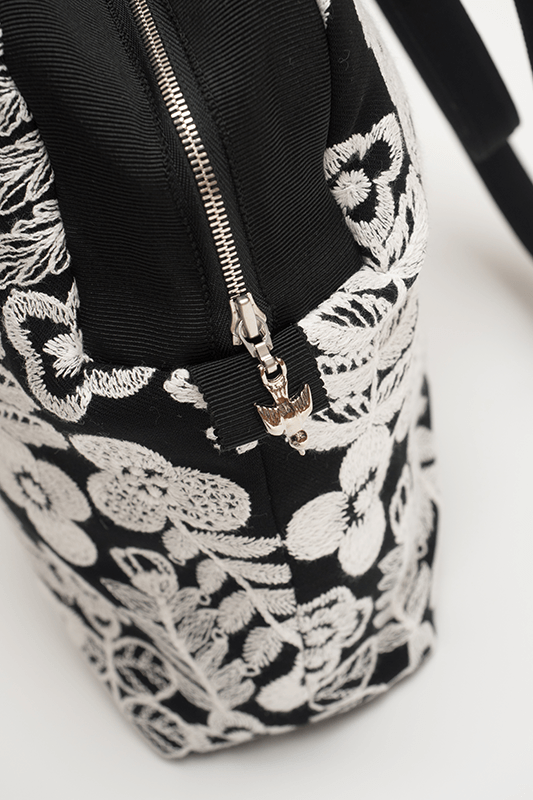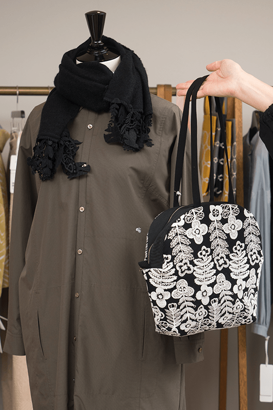 細かなラインで描かれた草花の刺繍が広がるバッグです。お花の周りに蝶々が舞い、暖かな光を浴びて花びらや葉っぱが楽しそうに風に揺れ動く姿を想い描いています。