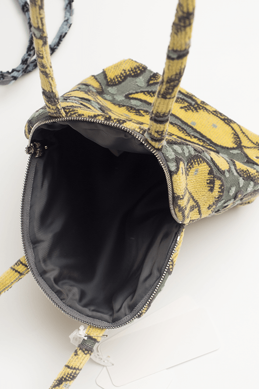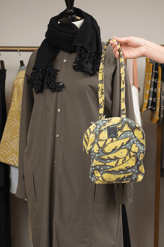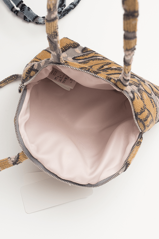 持ち手は肩に掛けられる長さに、丸いフォルムの上部はファスナー仕様に仕上げています。