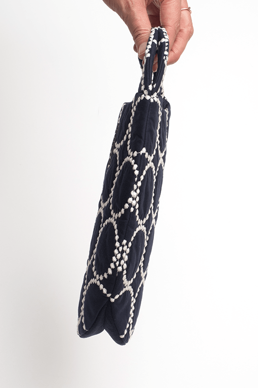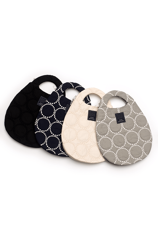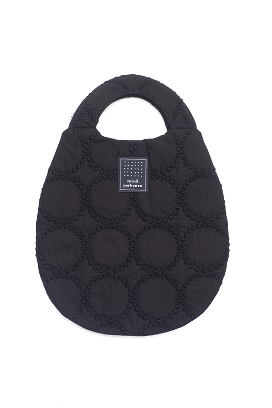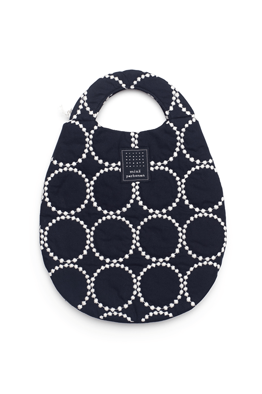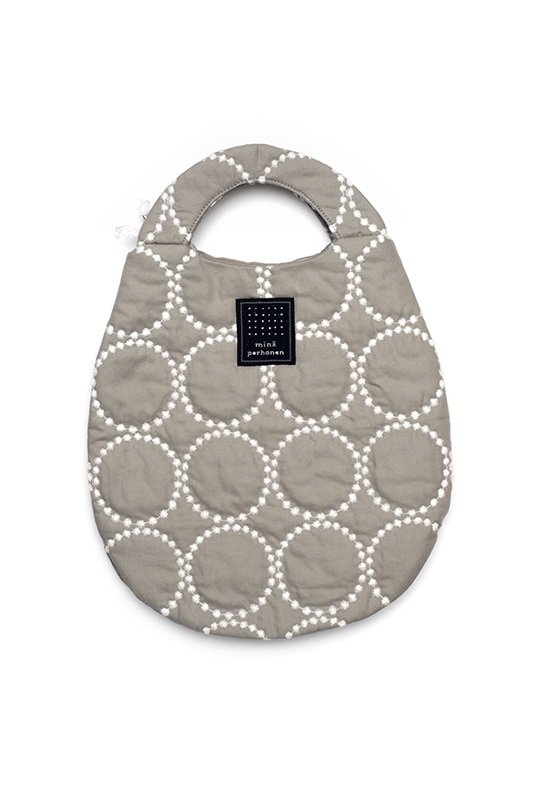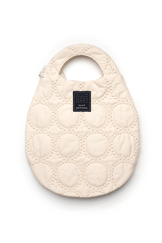 小さなドットが連なる、タンバリンをモチーフにしたサークル模様が刺繍された軽やかなバッグです。