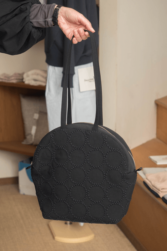 上部は丸いフォルムに仕上げ、開口部をファスナー仕様にした肩掛けのバッグです。