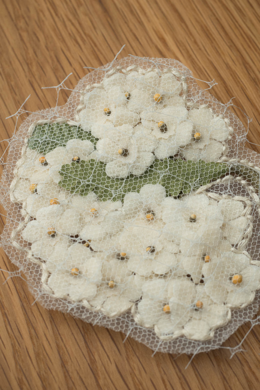小さなベルベットの桜草の花びらで立体的なブーケを作り上げ、それをそっと潰して平面のコサージュへと変形させました。 時間を閉じ込めた押し花のように、立体的な記憶を静かに封じ込めたデザインです。その上には繊細なシルクチュールとネットを重ね、記憶の深さや曖昧さを表現し、ラインステッチで丁寧に留め付けています。